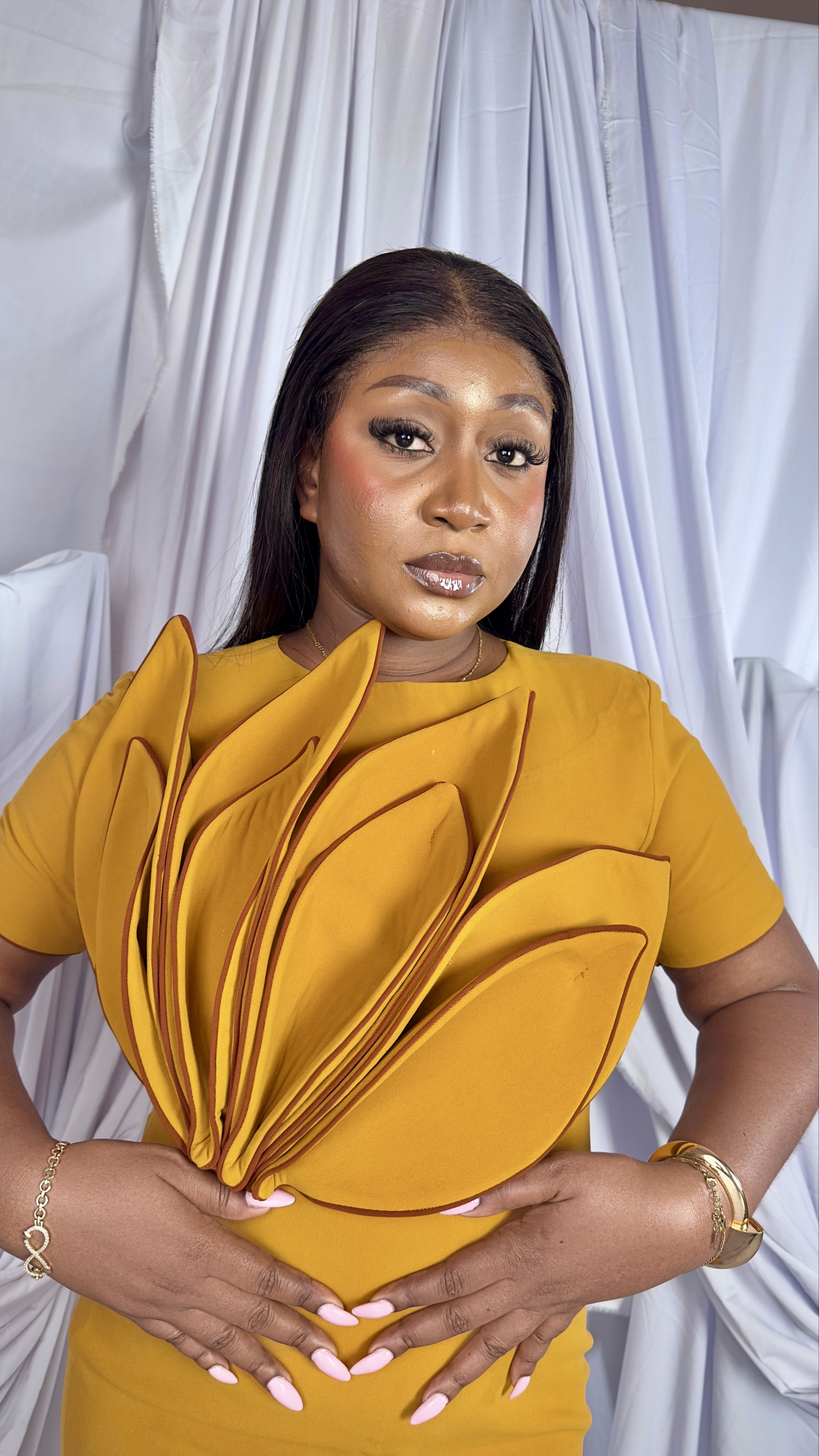 Crafted in a rich golden mustard hue, Alma features a sculptural floral inspired bodice that blooms gracefully across the chest, creating a dramatic feminine focal point.